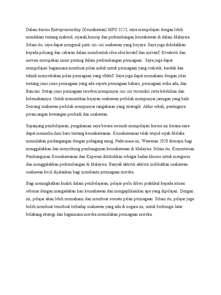 Semasa proses aktiviti ini dijalankan kami juga mengalami beberapa kesulitan sebagai contoh pengangkutan. Read this essay on strategic keusahawanan. Esai reflektif menjadi jenis esai yang mudah ditemukan. Abstrak dunia keusahawanan telah berkembang pesat di serata dunia yang merupakan salah satu alternatif bidang pekerjaan di kalangan penduduk dunia termasuk di malaysia. Leadership report nazir razak by faqihah.
