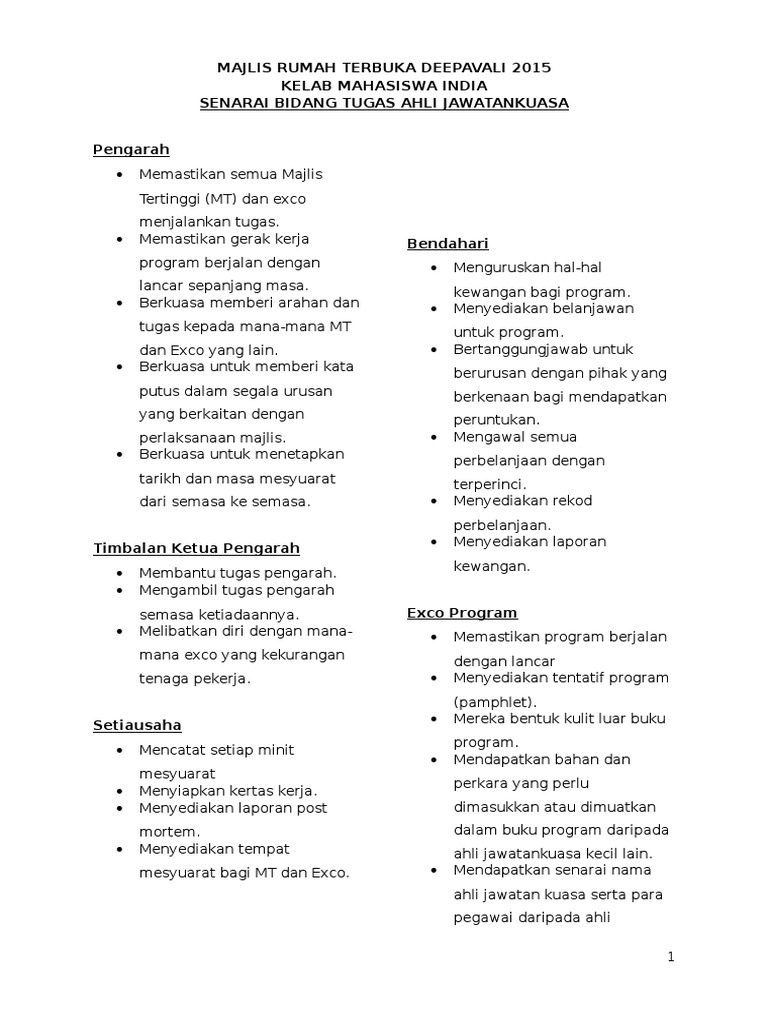 Senarai Tugas Ahli Jawatankuasa Program - Ahli jawatankuasa encik muhammad firdaus amir encik mohammad farhan chia mohd ibrahim puan marini musa puan hasnah hassan puan norasiken mohd noor.. Ahli jawatankuasa encik muhammad firdaus amir encik mohammad farhan chia mohd ibrahim puan marini musa puan hasnah hassan puan norasiken mohd noor. Salinan perjanjian sewa bangunan/perjanjian jual beli/ geran tanah senarai ahli jawatankuasa persatuan/pertubuhan. Edie azhar bin ramli bendahari : Tugas tugas ahli jawatankuasa by suhaiza shuib 30778 views. 9.jawatankuasa buku program 9.1 membuat draf isi kandungan buku program 9.2 menyediakan pamphlet yang berwarna untuk tetamu kehormat 9.3 membanyakkan dan mengedarkan buku program.